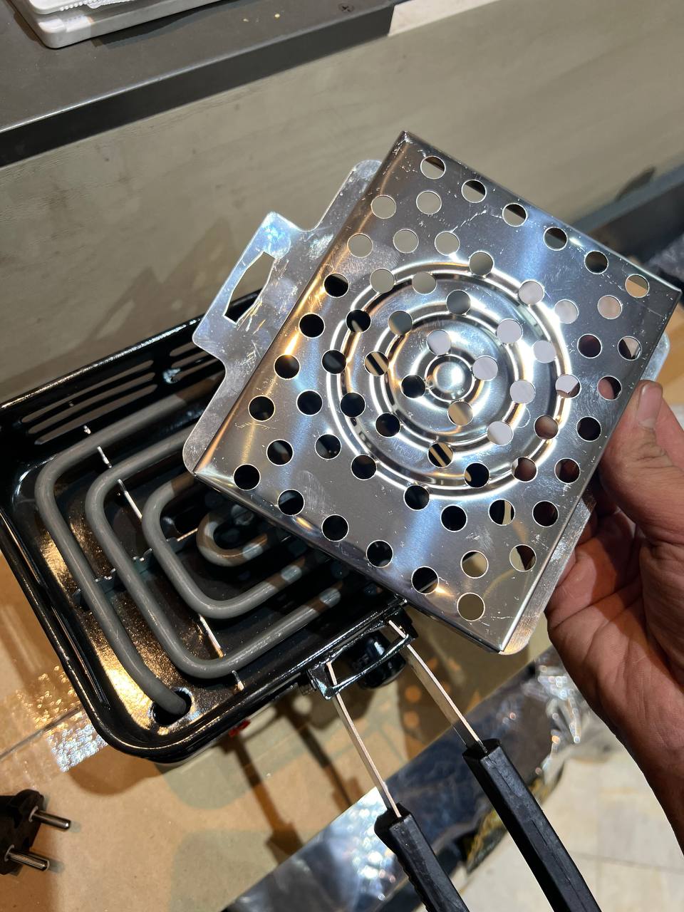 زغالها روی المنت قرار داده شده و دستگاه روشن میشود. المنت برقی حرارت را به طور یکنواخت به زغالها منتقل میکند.